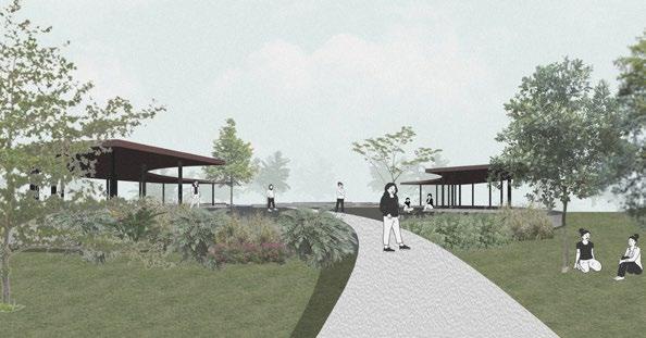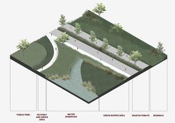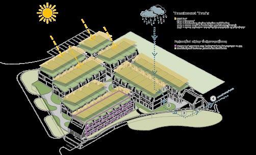 A treatment train for sustainability and green strategy on the site is also proposed. For sunlight, we suggest installing solar panels on the roofs to generate electricity for the community. For rainwater management, we design a landscape that incorporates rainwater harvesting, reducing the amount of water flowing directly into the creek. The rainwater will be filtered through strategically placed planting zones, which help in purifying and naturalizing the water.