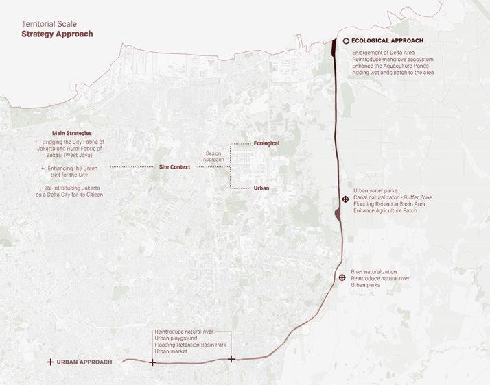 + Canal as a Bridge between the City Fabric of Jakarta and Rural Fabric of Bekasi (West Java) + Canal as a Platform to Enhancing the Green Belt Connection + Canal as a Media to Re-Introducing Jakarta as a Delta City for its Citizen
