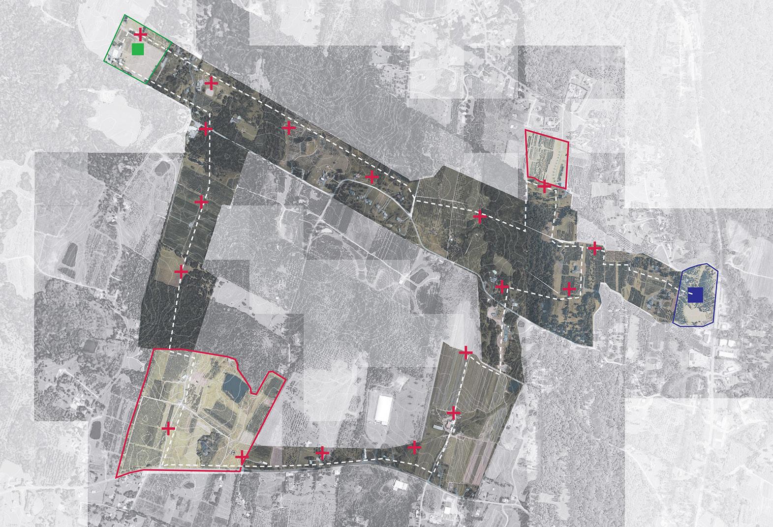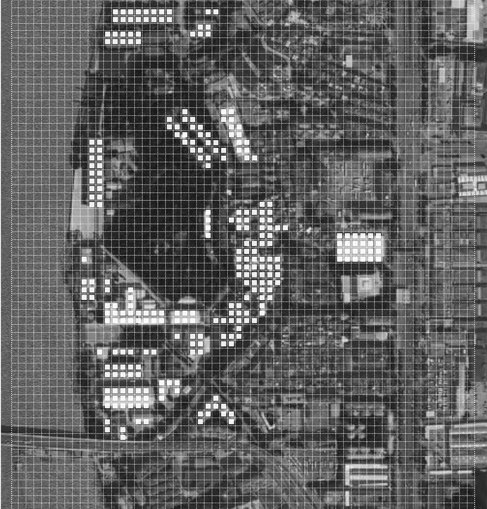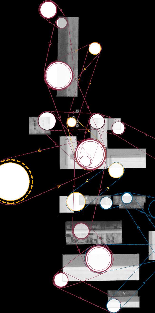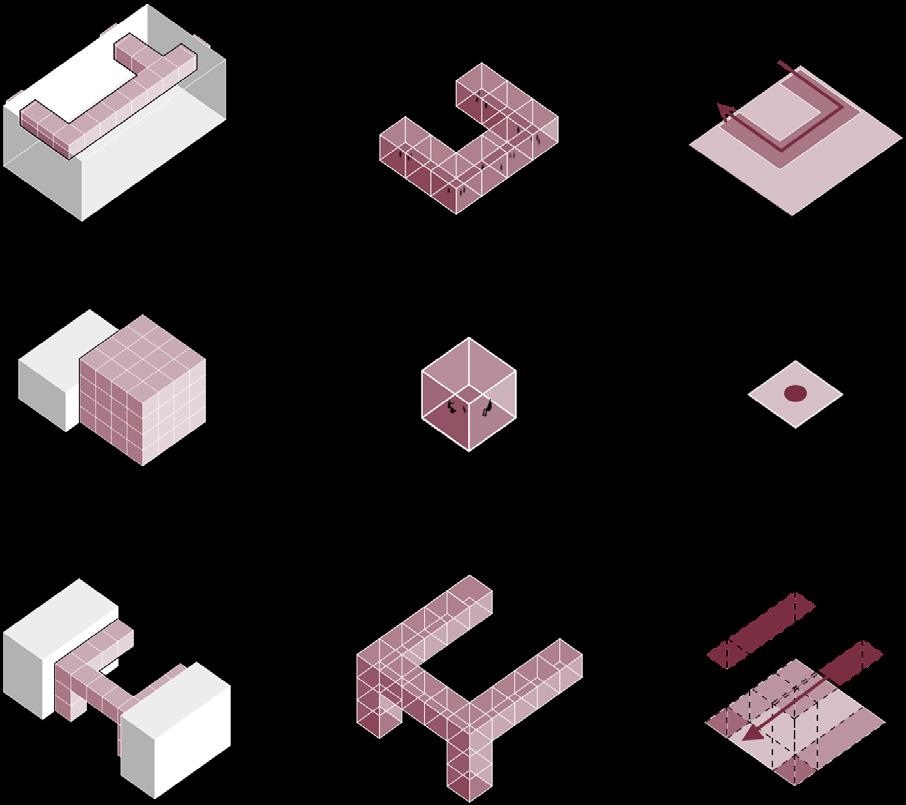 Tracing back each of function and streamline to the locations of relavent buildings in site, a fuction &flow mapping is eventually obtained. The grid distribution is exactly corrisponding to the functions & flows, reorganizing the site, despite the buildings' distribution. Therefore some buildings will be bridged, pentrated, or completely enclosed by the grid,creating various experience spaces therefrom.
