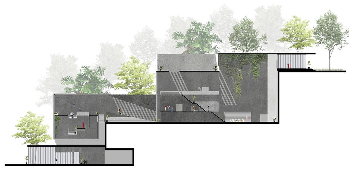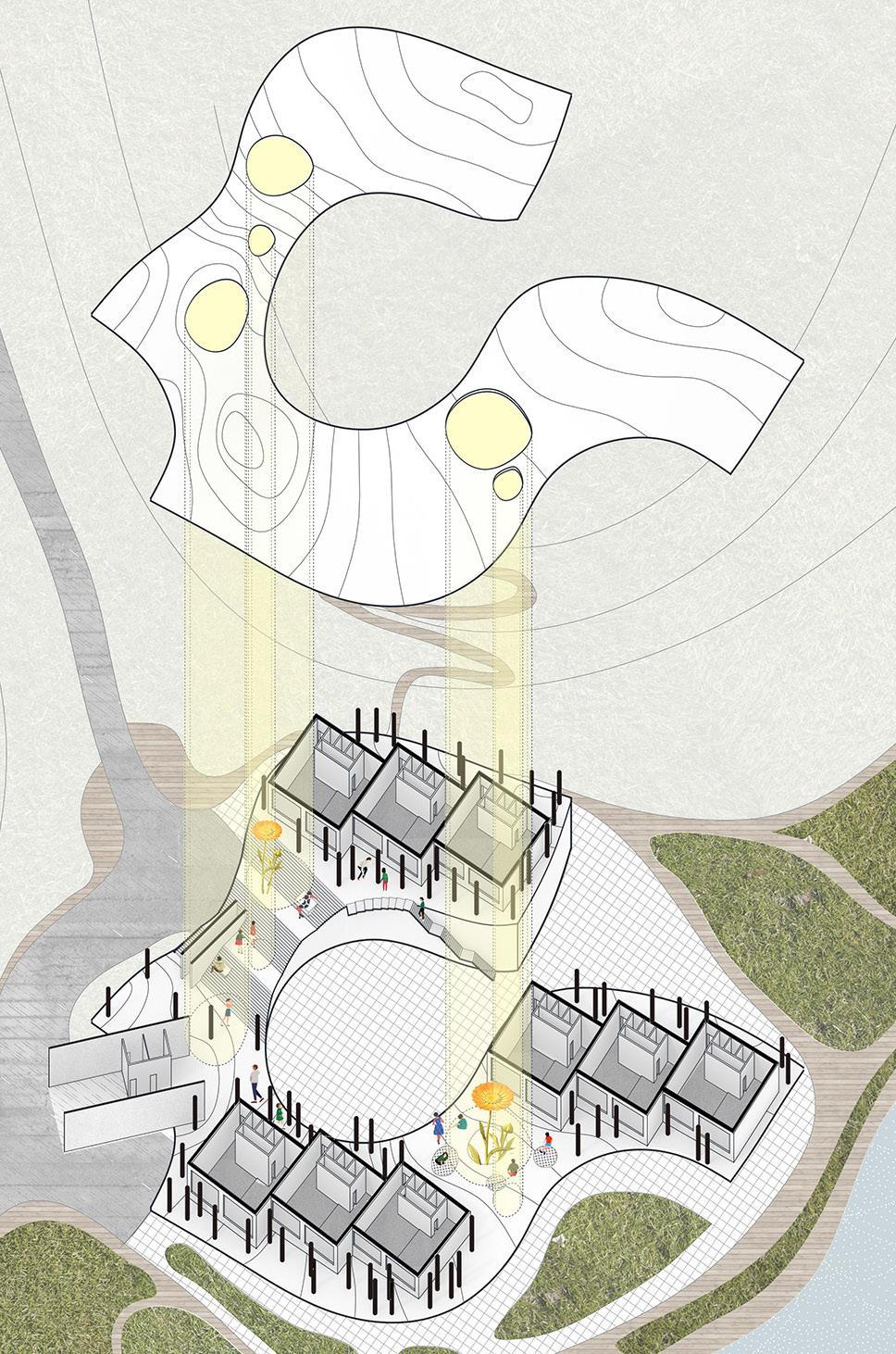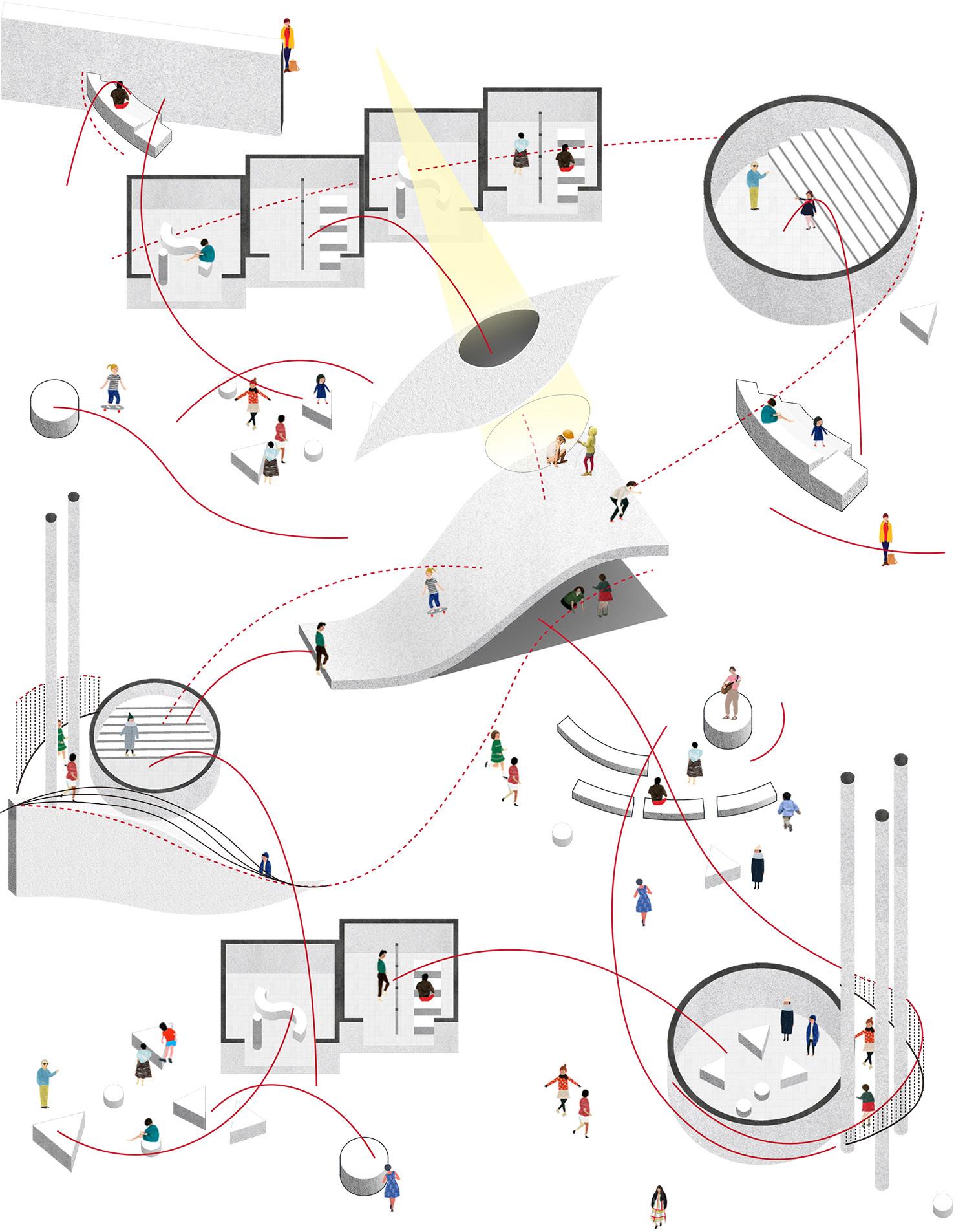 The follow four scenarios are typical ones that can well illustrate grid forms in the project, relationship with the buildings and experience spaces produced therefrom.