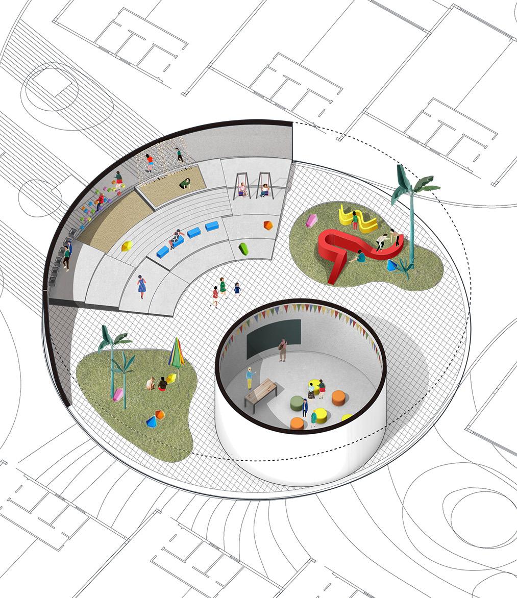 People can rest and enjoy the river-view on the playground. The chimneys also serves as a landscape sketch which can go inside.