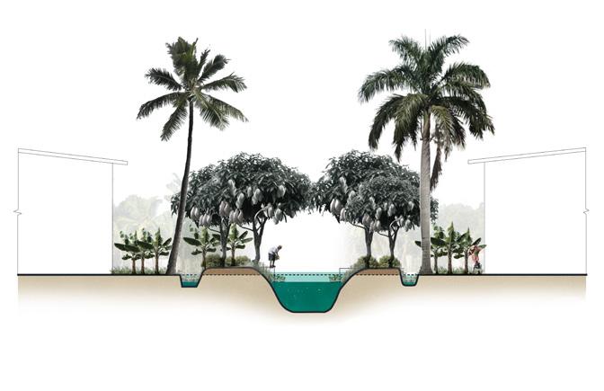 The chosen courtyard before reconstruction consists of two flat-roofed buildings and a sandwiched stripy yard.
