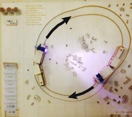 IThis is an interactive artwork.Numbers pasted on the board seemed to be placed randomly, but there hides secret in the shadow.There are two tiny spotlight on the top of two trains on the circle track. Visitors can operate the trains. If two trains arrive at the designated spot, visitors will find shadows of numbers are like a man and a woman. The two lovers can only meet each other then. Working Process