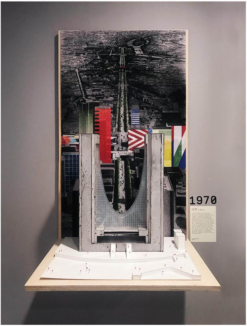 In 1970, I.M. Pei proposed the Diapason, or “tuning fork” at Tête Défense, the gateway to the area, aligned with the city’s historic Grand Axis. The pair of sixtystory concrete office towers were intended to dominate the surrounding chaos. Pei, attempting to preserve the vista through the Grand Axis, sketched a perfectly symmetrical megastructure knit together by a radically inverted glass arch. Killed by the oil crisis of 1973, Pei’s unique concept has deeply influenced subsequent proposals for La Défense, where the tuning fork’s site has been replaced by another carved out structure: The Grande Arche.