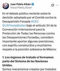 emite un documento que cuando lo uno lo lee es evidente, pues que tiene otra orientación, que es criticar al Gobierno de México, esencialmente, y llevar una posición a la Asamblea General de Naciones Unidas que nosotros consideramos, que dado que estamos atendiendo el tema, pues no tiene cabida”. No obstante, dijo que su gobierno trabaja con la ONU para atender este y otros temas. “No entendemos por qué esta extrapolación, por qué la extrapolación de crimen de lesa humanidad, cuando el gobierno está actuando. Si no estuviéramos actuando, estuviéramos cruzados de brazos, no nos importara, no reconociéramos que hubiera una situación como esta, no hubiéramos hecho leyes que modifiquen, fortalecido instituciones, atendiendo a las familias. Si no hubiéramos hecho nada, bueno, pero por qué no hay reconocimiento de lo que ha venido haciendo el gobierno”. La titular del Ejecutivo enfatizó que su gobierno tiene una excelente relación con el representante en México del alto comisionado de la ONU: “La secretaria de gobernación lo ha incorporado en todas las reuniones con colectivos, le ha dado los informes que tenemos y otras organizaciones de Naciones Unidas que nos están apoyando”. / KARINA AGUILAR