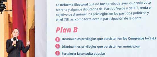La presidenta Claudia Sheinbaum informó que el próximo lunes enviará al Congreso un nuevo proyecto en materia electoral que propone disminuir privilegios en congresos locales y ayuntamientos, al establecer topes al presupuesto que se les destina, además de fortalecer los mecanismos de consulta popular a través de modificaciones que se espera sean constitucionales. La iniciativa deja intacto el presupuesto de los institutos políticos y no modifica el método de elección de legisladores federales plurinominales, hecho que provocó que el PT y el PVEM rechazaran la anterior MÉXICO P. 3