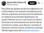 “Les puedo informar que en unas horas circulará el dictamen y la convocatoria a la reunión de las comisiones unidas, para discutir y aprobar el dictamen mañana mismo”, publicó el senador Mier Velazco. En tanto, el presidente de la Comisión de Puntos Constitucionales en el Senado, Oscar Cantón Zetina, afirmó que gobernadores, presidentes municipales, consejeros electorales y senadores han externado una serie de inquietudes sobre la reforma.
