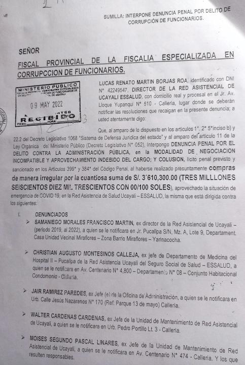 ElDirectordelaRedAsistencial de Ucayali EsSalud, Lucas Renato Martín Borjas Roa, interpuso denuncia penalporeldelitocontralaadministraciónpublicaenlamodalidad de Negociación Incompatible y Aprovechamiento Indebido del cargo; y Colusión.