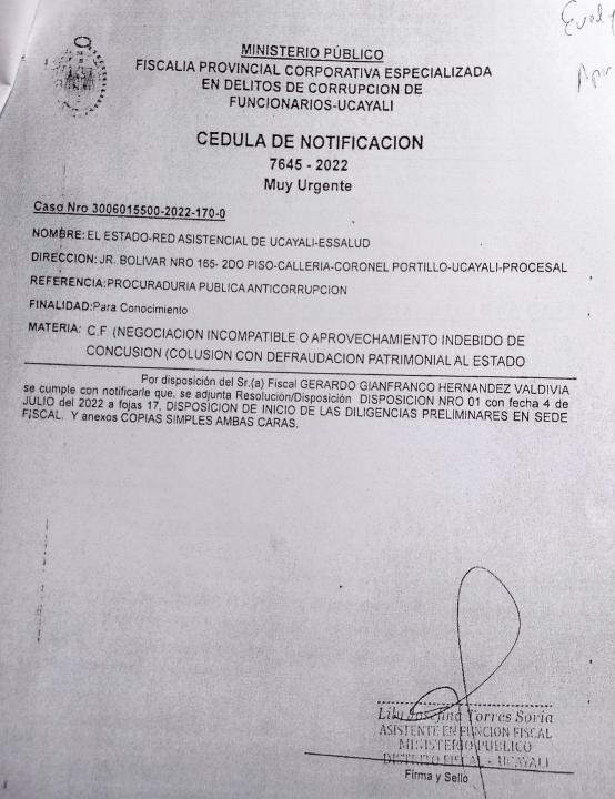 Aeste caso se suma el informe de control específico N°. 020-2022-OCI/0251-SCE, de la Contraloría General de la República, en la que concluye, que como resultado del servicio de control específico a hechos con evidencias de irregularidad practicado a la RedAsistencialUcayali,serecomienda al presidente ejecutivodelsegurosocialdesalud,serealicenlasaccionesa fin de que el órgano competente efectué el deslinde de lasresponsabilidadesquecorrespondan, de los funcionarios y servidores públicos de esta entidad, comprendidos enloshechosobservadosdel presente informe de control especifico.