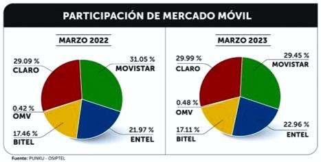 Deacuerdoconelportalinformático Punku, a marzo del 2023 Claro (2.01 %) y Entel (3.41 %) fueron las empresas que reportaron mayor incremento en número de líneas, conrelaciónalmismomesdel añoanterior Porsuparte,Movistar(-6.15%)yBitel(-3%)sufrieronlamayorreducción.