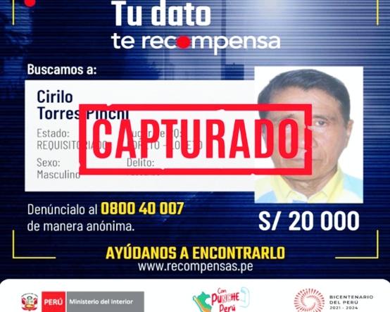 Tarapoto.La Policía Nacional del Perú (PNP) capturó a Cirilo Torres Pinchi,de75años,enla ciudad de Tarapoto, región San Martín Cirilio Torresespadredelacongresista Rocío Torres y estaba requisitoriado poreldelitocontralaadministración pública en la modalidad de peculado,yerasolicitadoporel Poder Judicial, informó elMinisteriodelInterior Losefectivosdelacomisaría de Tarapoto recibieroninformacióndeun colaborador que aseguraba conocer la ubicación de Torres Pinchi, quien estaba prófugo por 20 años y no había rastrosdesuparadero.