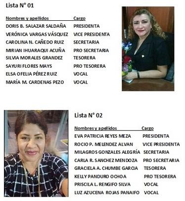 De acuerdo al cronograma el comité electoral ha presentadodoslistashábiles,lalistaunopostulacomo presidenta Doris Saldaña y lo integran Verónica Vásquez, como vice presidenta,CarolinaCañedo Ruiz, Mirian Ihuaraqui Acuña, Silvia Morales Grández, Sayuri Flores Mays, Elsa Ofelia Pérez RuizyMaríaCárdenasPezo.