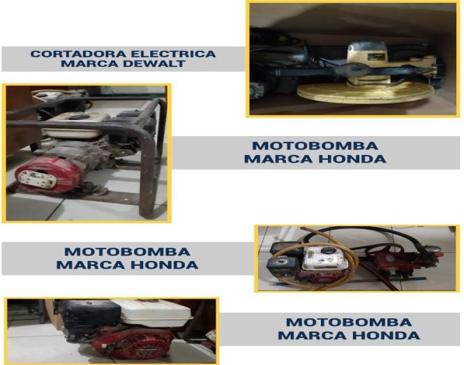 Entre los equipos figuran: un motorgeneradormarcaHonda, dos motobomba marca Honda, una amoladora eléctricamarcaDewalt,unaamoladora eléctrica marca Cindhel, una cortadora de metal marcaDewalt,unacortadora demetalmarcaEinhell,untaladropercutormarcaStanley Otras herramientas encontradasfueron:dossierrascaladorasmarcaMakute,unrotomartillo marca Royce, una mezcladoradeconcretomarca Concret Mixel, serie