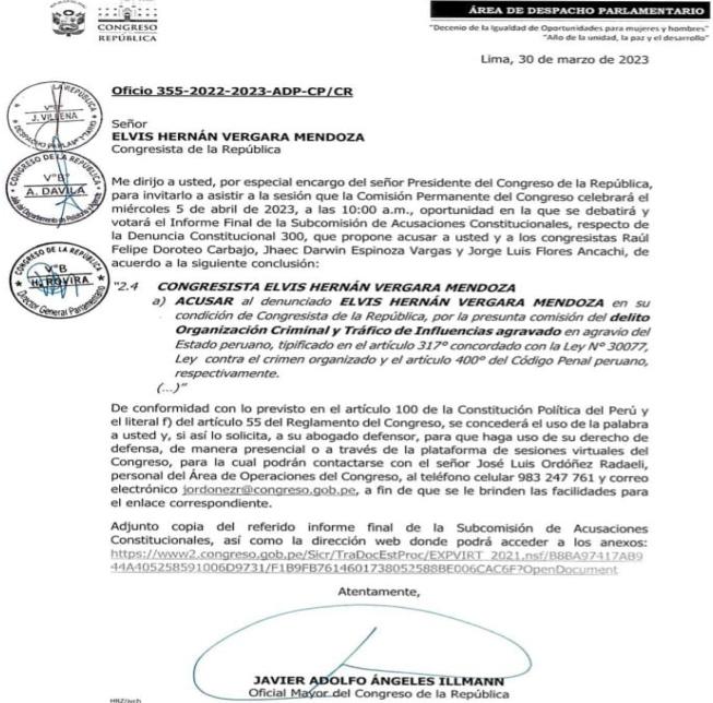 Así es, este miércoles 05 de marzoalas10am,estácitado por la presunta comisión de los delitos arriba mencionado. El denominado integrantedeLosNiñosElvisVergara.Algunos medios nacionales espera que el congreso y sus más nobles obligaciones con el país, no den la espaldaalapoblaciónquelo eligiódetalmaneraquenosiga blindando a estos malos congresistas.