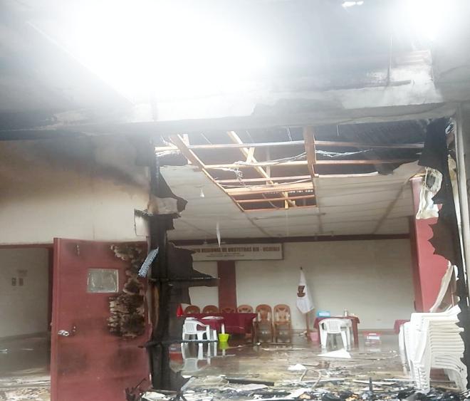 Reducidaaescombros,terminó una parte del techo y la pared del local del colegioregionaldeobstetrasde Ucayali,alparecer productodeuncortocircuitoenla reddeenergíaeléctricainstaladoporelcielorraso. Ocurriócercadelas4dela madrugada de ayer, cuando todos descansaban Hasta el lugar llegaron los bomberos quienes lograronsofocarelincendioydieron tranquilidad a los vecinos del pasaje Urubamba cerca de la avenida Unión enYarinacocha. Vecinosdelsectoravisaron sobreelterriblehechoalas autoridades.Dos cisternas llegaron hasta el lugar Lograron apagar las llamas que amenazaban con alcanzar el techo de una vivienda vecina. (Miller Murrieta)