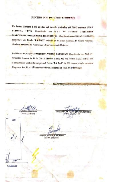 elaparentecompradorHumberto Verde Bauman y vendedores Gregoria Rojas SosayJuanFlorida;supresunta falsedad se demuestra conlacartadeaclaracióndel juez de paz no letrado de puerto Sungaro, con fecha 23demayode2019. Esos documentos presentados por Francisca Adrian Advincula,indicanqueHumberto Verde Bauman, nunca se apersonó a su despacho parafirmarylegalizarunrecibodepagoporterreno. Nuestrodiariobuscólaréplica de los denunciados y tuvo acceso al recibo de pago porpagodeterrenoencuestión por 35 mil soles, el mismo que los agraviados aseguran los habrían hecho firmar en blanco. En tanto que en el Juzgado de Puerto Inca, aseguran que este caso se encuentra en proceso deinvestigación.
