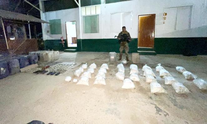 bolsas plásticas conteniendo una sustancia blanquecina rocosa que hacen un peso total de 42.815 kg. de presunta cocaína y en el tercer costal con pertrechos de guerra tales como 08 cacerinas, 25 municiones calibre 16”, 248 municionescalibre9x19mm,510municiones de 5.56x45, 316 municionesde7.62x51yunequipo de comunicación (radio portátil). Además se halló un centro de
