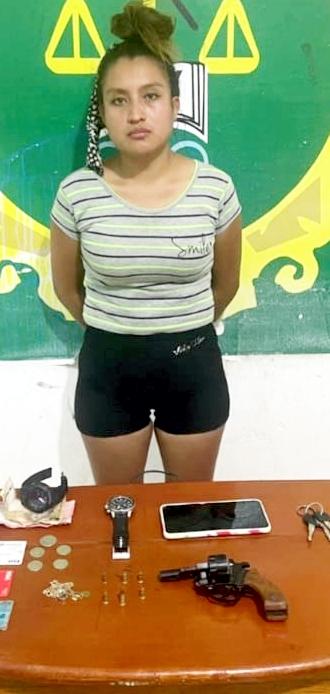 anterior (sábado) fuedetenida Shakerem Victoria Dávila Tuanama (a) “Gata” de 23 años, en la intersección de las avenidas Colonización conBellavista,distritodeCallería. La“Gata”sedesplazabaconduciendo una motocicleta marca Honda, modelo “GL 125-chacarera”, color negrodeplaca4026-DU.En sucarteraleincautaronunrevolver con la serie “erradicada”,abastecidaconseismuniciones calibre 22 milímetros.