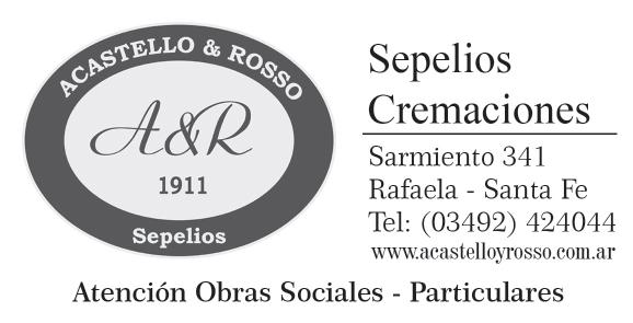 Falleció el 19/01 a la edad de 83 años. Sepelio: 19/01 a las 17:00 hs en el Cementerio Municipal, previo oficio religioso en Parroquia Nuestra Señora de Fátima. Servicio: Acastello & Rosso.