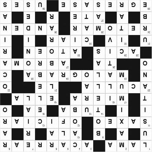 1 Portugués. 2 Máximo (límite). 4 Arbol meliáceo, de tronco alto, de madera muy estimada en ebanistería. 5 Primera letra del alfabeto griego. 6 Quité algo de una superficie como raspándola. 7 Terreno baldío. 8 Extraño, poco frecuente. 9 Vasija de cuello angosto para líquidos (pl.). 13 Famoso. 15 Carbonato de sodio cristalizado. 18 Que se infiere o puede inferirse. 19 Preparar por medio del trabajo adecuado. 22 Instrumento músico de viento (pl.). 24 Mamífero roedor muy perjudicial, más grande que el ratón. 25 Las musas. 29 Emplazar a uno. 30 Viento, corriente producida en la atmósfera (pl.). 31 Ciudad, especialmente la muy populosa. 33 Prueba el gusto de una cosa.35 Pero.