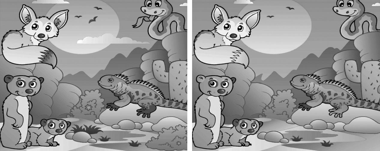 Soluciones: 1) Falta la nube. 2) Falta el cactus. 3) La serpiente no tiene lengua. 4) El pico de la montaña es diferente. 5)