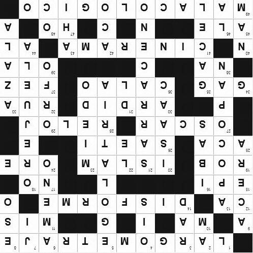 2 Ante meridiano. 3 Unidad de radiactividad. 4 Percibís el sonido. 5 Culto, adoración, amor excesivo de sí mismo. 6 Grato, agradable. 7 El gallo, en el horóscopo chino. 8 Pronombre demostrativo. 9 Línea de baldosas a los costados de la calle. 13 Hacen uso de la apócope. 16 Te dirigías. 18 Cada una de las dos asas pequeñas que suelen tener las escudillas, bandejas u otros utensilios semejantes. 20 Patriarca hebreo, hijo de Abraham y padre de Jacob. 21 Agareno. 22 Dativo del pronombre de tercera persona. 23 Perturbación angustiosa del ánimo por un peligro real o imaginario. 29 Variedad de besugo, de color rubio, ojos grandes y dientes como de sierra. 31 En números romanos, "550". 33 Entre los mahometanos, oración o súplica. 35 Macho de la gacela. 40 Voz que, repetida, designa un pueblo negro del Sudán oriental. 42 Arbol venezolano de madera imputrescible. 43 En ese lugar. 46 Sexta nota musical. 48 Antigua lengua provenzal.