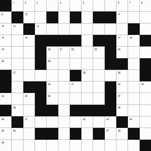 1 Película cinematográfica de larga duración, alrededor de noventa minutos o más. 10 Apócope de mamá. 11 Pronombre posesivo de primera persona (pl.). 12 Símbolo del calcio. 14 Deforme. 15 Prefijo "sobre". 17 Negación. 19 Arrope o zumo de una fruta mezcladaconmiel.20Islamismo.24Elevéplegaria.25 En este lugar. 26 Tejido de raso. 27 Nombre de varón. 28 Máquina para medir el tiempo. 30 Artimaña, engaño. 32 Calle en un poblado. 34 Situación ridícula y cómica. 36 Ave coraciforme de gran tamaño de varias islas del Pacífico. 37 Gorro que usan los musulmanes. 38 Símbolo del sodio. 39 Onda en el mar. 41 Cinematógrafo basado en la proyección de tres imágenes que se yuxtaponen para dar la impresión de relieve en la pantalla. 44 Contracción. 45 Especie de cerveza inglesa. 47 Símbolo del holmio. 49 Relativo a la parte de la zoología que trata de los moluscos.