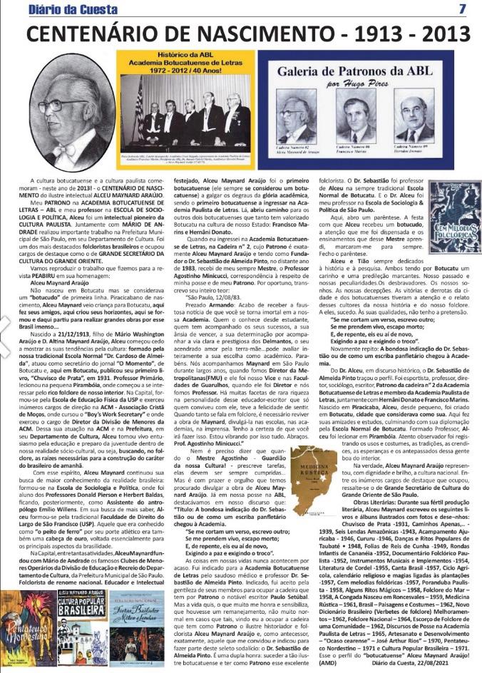 – Consagrado folclorista do país, Alceu Mainard de Araújo dirigiu as Faculdades de Guarulhos, foi Secretário da Cultura do Grande Oriente e foi o precursor do ingresso dos botucatuenses na Academia Paulista de Letras. Na Capital, atuou com Mário de Andrade no Departamento de Cultura da Prefeitura de São Paulo.