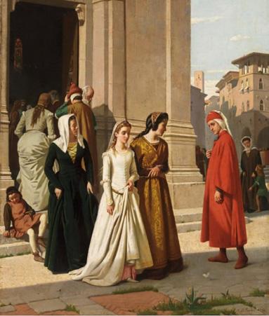O Primeiro Encontro - Dante descreve na “Vita Nuova” o primeiro encontro dele com Beatriz. Foi durante a festa de “Calendimaggio”, uma festa popular feita no dia 1 de maio para comemorar a chegada da primavera e verão. Para esta ocasião, os bairros de Florença (na época seis), organizavam festas com música e comida.