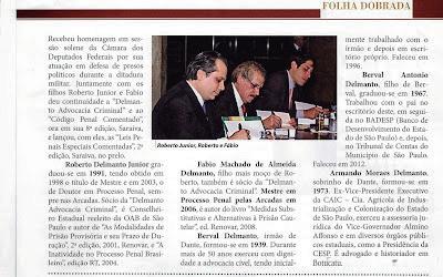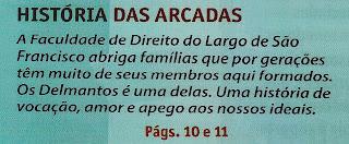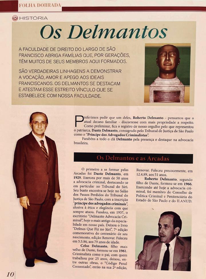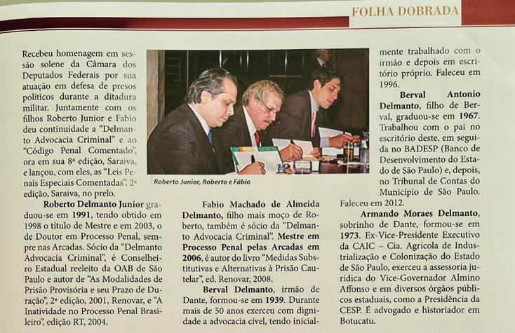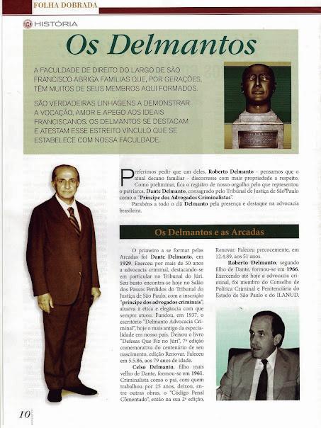 Foi extremamente honroso para mim a inclusão de meu nome na matéria sobre os membros da Família Delmanto que passaram pelas ARCADAS DA SÃO FRANCISCO. O texto é de responsabilidade do decano dos advogados da família formados naquela tradicional e sempre nova Academia, o meu primo Roberto Delmanto, advogado criminalista que mantém a tradição do escritório “DELMANTO ADVOCACIA CRIMINAL”, inaugurado em 1937, por seu pai, DANTE DELMANTO, considerado o “príncipe dos advogados criminalistas”. A matéria saiu na revista “FOLHA DOBRADA”, nº 48, da Associação dos Antigos Alunos da Faculdade de Direito da Universidade de São Paulo (USP). O destaque foi dado a DANTE DELMANTO, que se formou em 1929, com especialização no Tribunal de Haia/Holanda. Durante o seu curso, Dante trabalhou no escritório de MARREY JUNIOR que tinha o melhor escritório de Direito Criminal na época e era considerado o melhor criminalista do Brasil. O CÓDIGO PENAL COMENTADO (Saraiva), de autoria de Celso Delmanto, Roberto Delmanto, Roberto Delmanto Júnior e Fábio de Almeida Delmanto, é considerado, em suas sucessivas edições, o preferido por profissionais e por acadêmicos de direito.