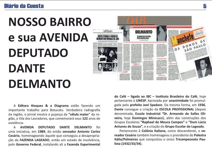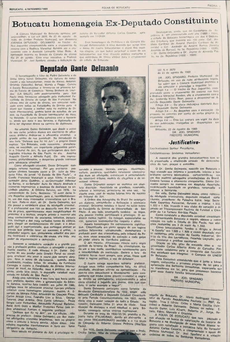 É sempre difícil falar de si mesmo ou de seus familiares Mas é tão gratificante que não dá para que não se dê o devido destaque. A começar por Dante Delmanto, botucatuense que brilhou na política, nos esportes e na advocacia. Foi eleito deputado estadual, por Botucatu, com 28 anos de idade e com a maior votação de todo o estado: era advogado criminalista do escritório de Marrey Junior, considerado o melhor criminalista de sua época e líder da maçonaria; Dante, nas eleições de 1934, conseguira o Tricampeonato Paulista para o Palestra-Itália (Palmeiras) e representava Botucatu e grande parte do interior paulista que havia se mobilizado pela Revolução Constitucionalista de 1932.