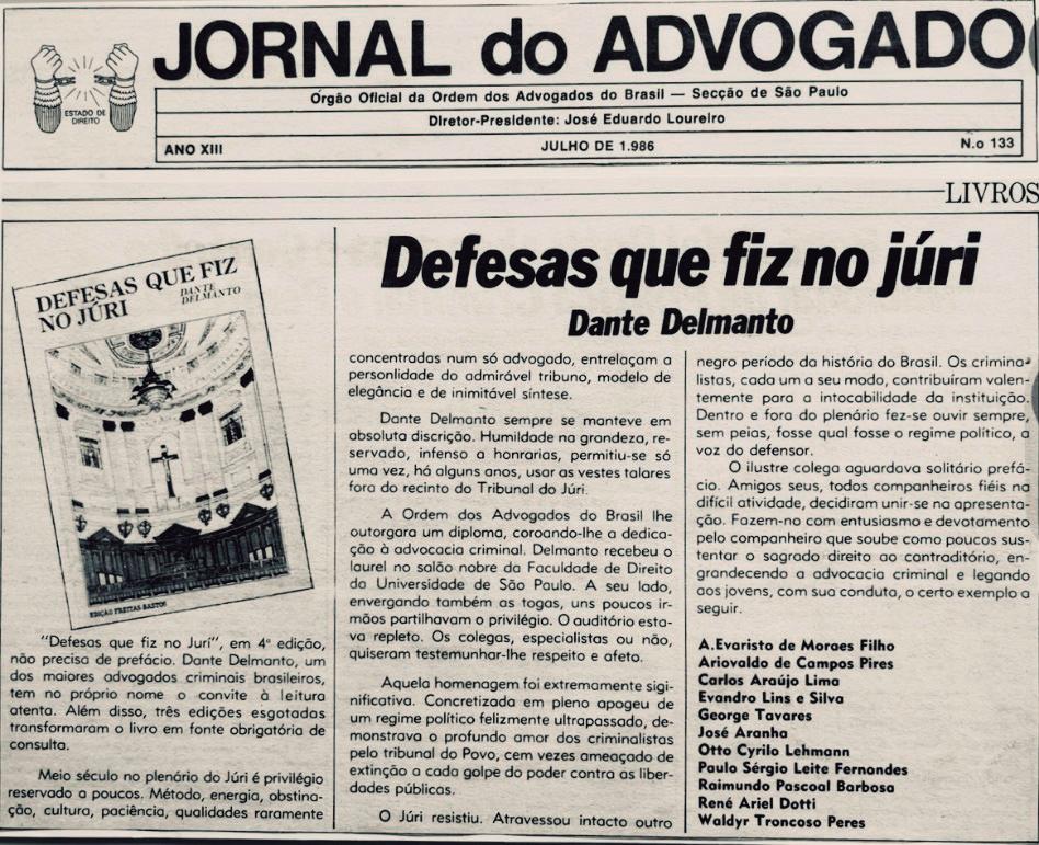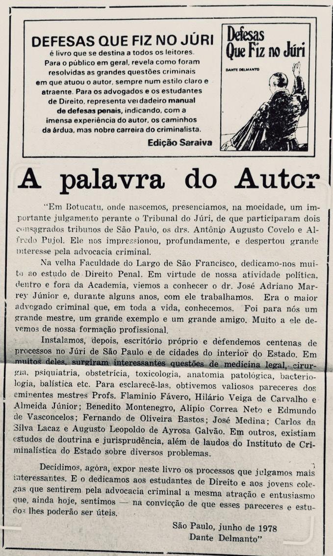 Com uma atenciosa dedicatória - o que muito nos desvaneceu e honrou - vimos de receber do Dr. Dante Delmanto, um exemplar de seu livro “DEFESAS QUE FIZ NO JÚRI”, lançado pela Saraiva, em princípios de Outubro último, cuja repercussão impressionou entusiasticamente os meios jurídicos do País, eis que a obra é um paciente trabalho de dois anos em que o Autor selecionou de seus centenares de processos vitoriosos, trinta e oito casos de brilhantes lutas na esfera criminal, através dos quais sobreleva sua profunda cultura humanística sedimentando uma vida profissional admirável. Tão grande foi o êxito do livro, que em menos de um mês de lançamento, tornou-se o campeão de vendagem na Feira do Livro de Ipanema patrocinada pela Prefeitura do Rio de Janeiro. Concomitantemente eram vendidos em São Paulo-Capital, mil e cem exemplares em menos de quinze dias. Leitura sedutora, acessível mesmo aos leigos, tocou-nos profundamente a frase inicial do Preâmbulo assim expressa : “ Em Botucatu, onde nascemos...” Depois do tributo à esposa e filhos, o Autor se volta para a terra-mãe, ao berço que lhe propiciou com os estudos preliminares, o primeiro encontro com o raciocínio dialético, no Fórum local.