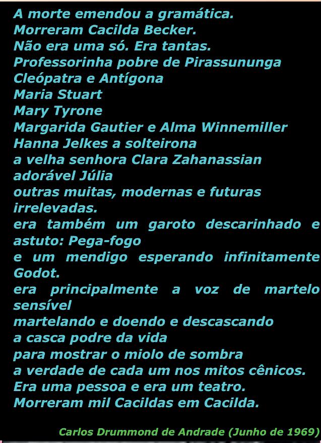 Cacilda Becker (1921-1969) foi atriz brasileira. Considerada uma das personalidades mais importantes da classe teatral brasileira e líder da categoria na primeira fase do Regime Militar de 1964.
