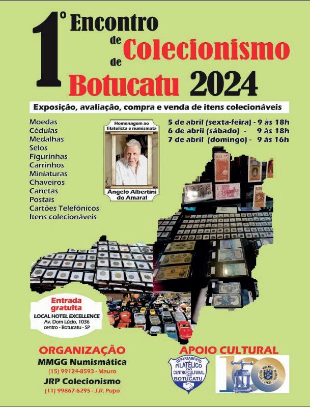 O Encontro tem a entrada gratuita e ocorrerá em Botucatu nos dias 5, 6 e 7 de abril, sexta a sábado das 9h às 18h e no domingo das 9h às 16h, no salão do Hotel Excellence, situado à Avenida Dom Lúcio, 1036 (próximo a AAB), com a participação de 17 expositores com diversos itens colecionáveis como cartões telefônicos, selos, postais, cédulas, moedas, figurinhas, tampinhas, miniaturas, medalhas, chaveiros, carrinhos, relógios canetas, acessórios para guardar coleções, catálogos e outros itens relacionados. É organizado pelas empresas MMGG Numismática e JRP Colecionismo de João Ricardo Pupo e Mauro Vasconcellos, que trazem uma estrutura e comerciantes de diversas localidades e segmentos.