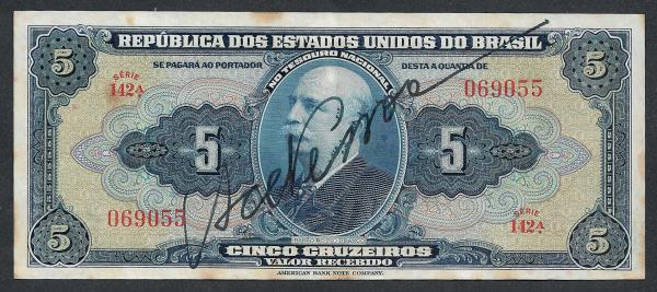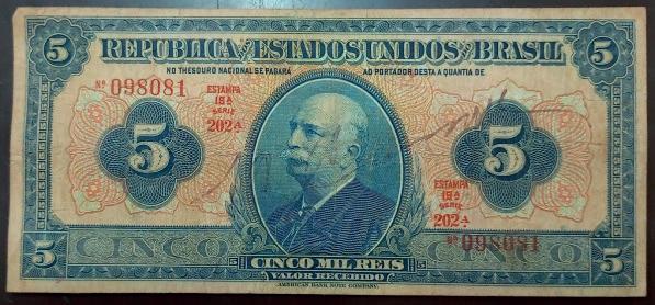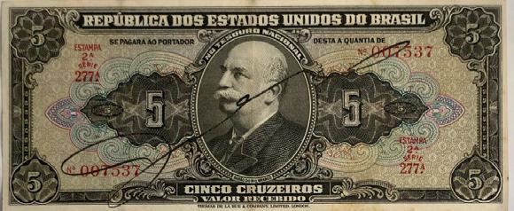 Nas cédulas, a figura do Barão do Rio Branco já é conhecida nas de réis lançadas pelo Banco do Brasil e Tesouro Nacional, temos a 5 mil réis de 1913 e novos modelos em 1923, 1924, 1930 e 1936. Na mudança de plano monetário para o cruzeiro, a cédula de 5 mil réis, de 1936 recebeu um carimbo (rosácea) em que passou a valer 5 Cruzeiros. Essas cédulas de réis eram assinadas (autografadas) uma a uma, por funcionários designados para esse fim.