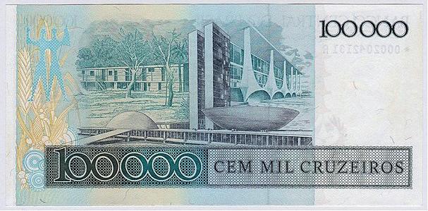 Essa cédula nasceu como 100.000 cruzeiros e com a inflação desenfreada em apenas um ano, acabou perdendo 3 zeros. Foi tão rápido, que não daria tempor de refazer e as cédulas e receberam um carimbo, passando a valer "100 cruzados" nessa alteração, posteriormente foram refeitas com o novo valor impresso.