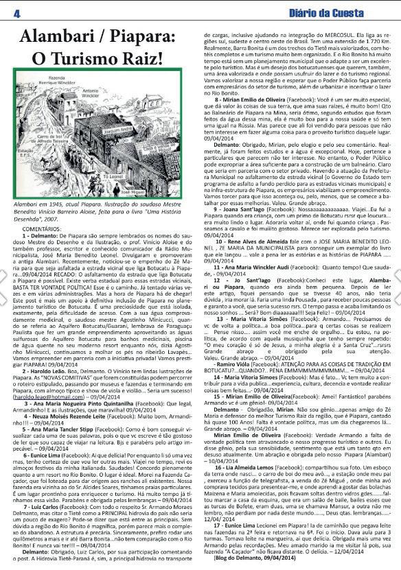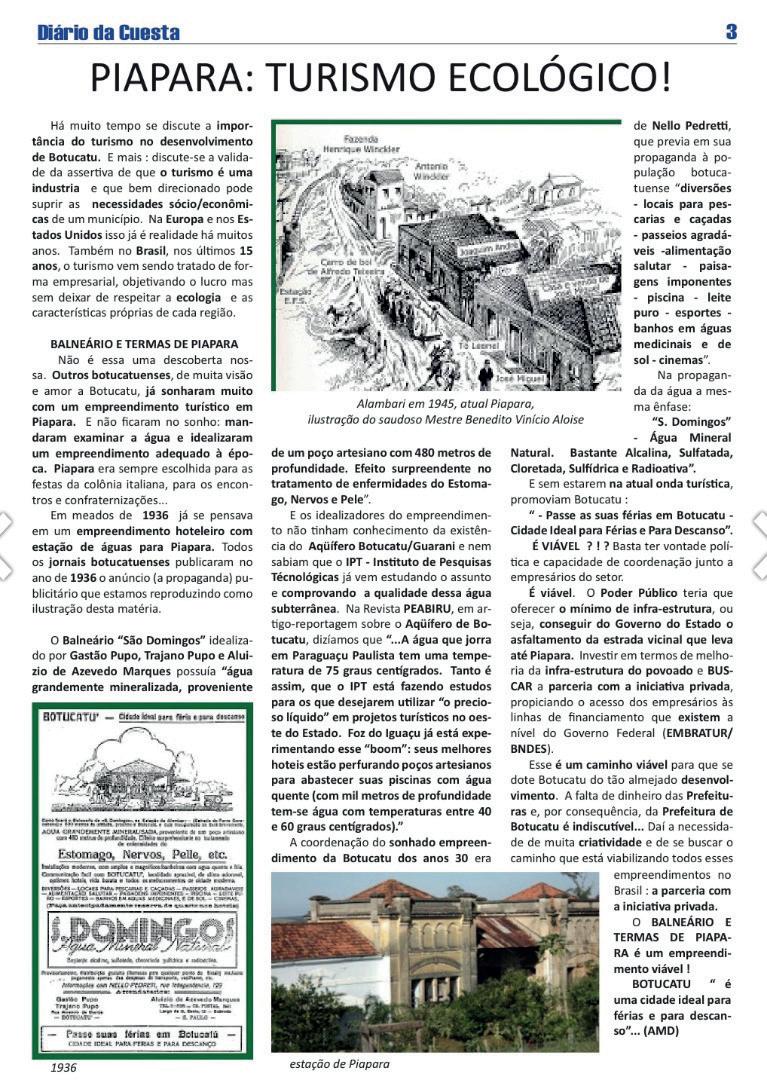 – Continua uma promessa o aproveitamento turístico de Piapara (Alambari). A exploração da água mineralizada de Piapara está a merecer do Poder Público o devido apoio e implantação viabilizando, assim, o grande sonho dos botucatuenses do passado.
