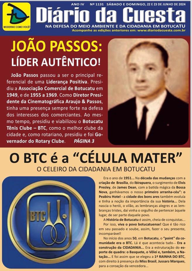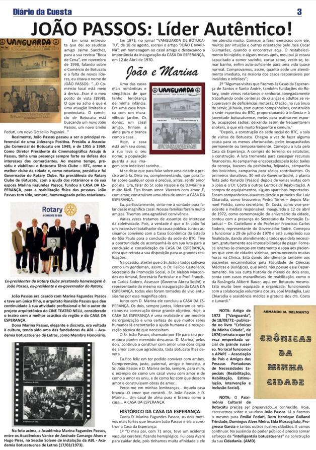 - OLAVO PINHEIRO GODOY: A edição do “Diário da Cuesta” retrata, neste fim de semana, uma grata homenagem a um dos clubes sociais que marca, na história citadina, muitas e muitas passagens deslumbrantes, vividas pelos botucatuenses Posicionou, com galhardia, o jornalista Armando Delmanto, a rememoração, da presença do benemérito João Passos como cidadão prestante na comunidade. Personalidade marcante; atuante na área comercial e social. O casal João e Marina Passos contribuíram, sobremaneira, para o desenvolvimento de nossa terra. Lembro-me, do Prof. Oswaldo Minicucci, na sala de aula da inesquecível Escola Industrial, falando da figura de João Passos como empresário, homem público e, defensor das causas botucatuenses. Em agradecimento, pelos serviços prestados, a Edilidade local, mudou a denominação de uma de nossas principais vias públicas, a rua Cesário Alvim - político da república velha - para rua João Passos - Líder Autêntico - Parabéns!