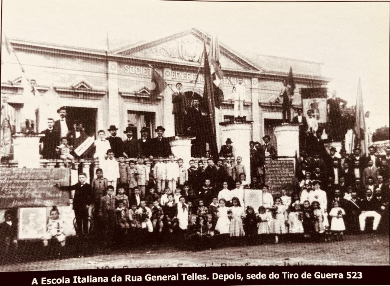 “Escola Italiana “Dante Alighieri”. Um dos itens estatutários da Societá Italiana de Beneficenza previa trabalhos e cursos visando à difusão da língua e da cultura italianas. Para cumprir o dispositivo, foi criada, em 1907, a escola que levou o nome do florentino. Ganhou edifício especial à Rua General Teles (demolido nos anos 70, depois de servir de sede ao Tiro de Guerra). Diretor, o agente consular Olivo Andolfato até setembro de 1917, quando a escola contava com 78 alunos. Disposição do governo brasileiro trancou escolas em língua estrangeira, passando esta a funcionar com aulas apenas em português, ministradas por Celestino Fazzio. Em 1935 estava já reaberta para cursos também em italiano, sendo professores Agostinho Revedello e Maria Violetta Terrugi. Encerrou atividades com a dissolução da Societá nos anos 40 Sebastião A Pinto,( “Folha de Botucatu”, “XX de Setembro, 6.10.1968) registra, ainda, sobre escolas italianas: “Ao lado do consulado funcionava a Escola Italiana, que era dirigida pelo professor Golfiero. Esta escola foi extinta com a nacionalização intensiva que se processou no Brasil depois da guerra”.
