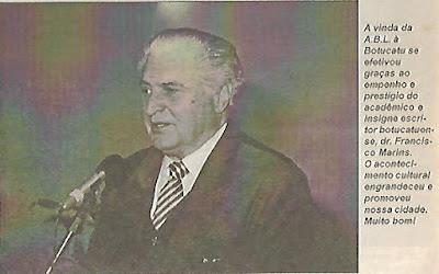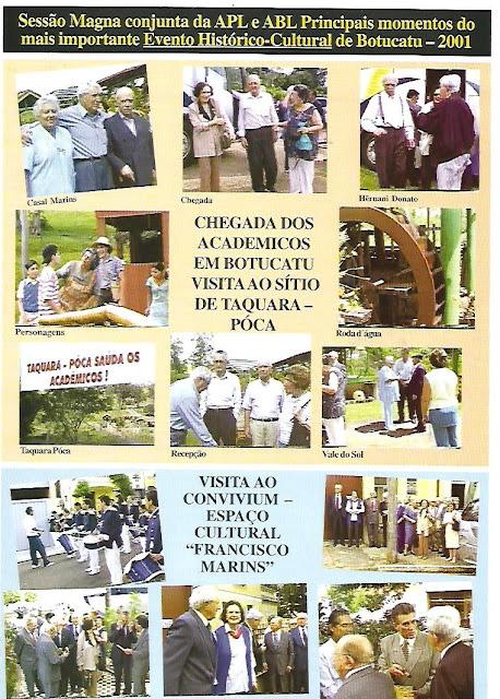 A programação das festividades de comemoração dos 146 anos de Botucatu começou com a SESSÃO MAGNA CONJUNTA DA APL E DA ABL, realizada no Teatro Municipal “Camillo Fernandes Dinucci”. Sucesso total. Pela primeira vez, a tradicional Academia Paulista de Letras fazia sua reunião fora da capital . Certamente, uma vitória do escritor botucatuense , membro da APL e patrono da ABL , FRANCISCO MARINS!
