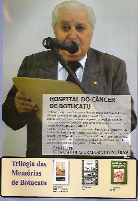 Botucatu comemorou o CENTENÁRIO DE FRANCISCO MARINS ocorrido no dia 23 de novembro de 2023. Intelectual de destaque e escritor que marcou gerações, Marins hoje tem uma Escola Municipal no Distrito de Rubião Junior que leva seu nome. Junto a Hernâni Donato, Marins sempre elevou a cultura de Botucatu, prestigiando as entidades culturais da cidade e divulgando a tradição de nossa região com o Ciclo do Café. O sonhado Hospital do Câncer de Botucatu tembém foi uma prioridade na ação social de Francisco Marins. Relembre a atuação de FRANCISCO MARINS nas publicações desta edição.