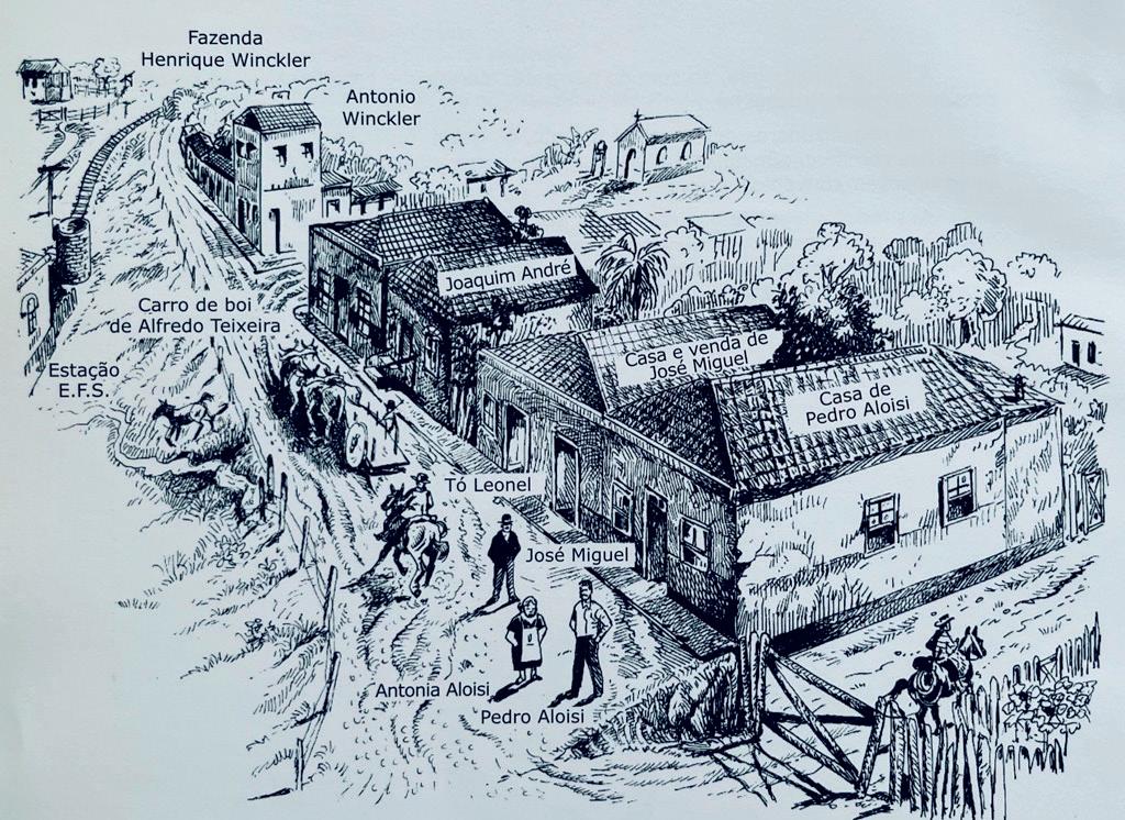 Alambari em 1945, atual Piapara, ilustração do saudoso Mestre Benedito Vinício Aloise