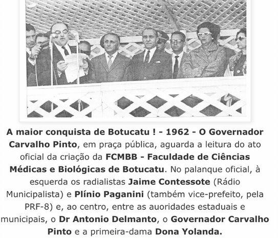 5– A MAIOR CONQUISTA DE BOTUCATU foi registrada em praça pública, com a presença do governador Carvalho Pinto, que fez a entrega simbólica do ato assinado criando a FCMBB, em 1962