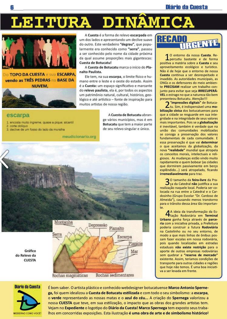O DIÁRIO DA CUESTA desde seu lançamento tinha a exata noção de seu espaço no webjornalismo. Tinha que ser um jornal POCKET. Tinha quer ser diário e online e trazer em pouco espaço no�cias importantes e rápidas e, ao mesmo tempo com textos mais longos, divulgar relatos históricos referentes a Botucatu, para que não se percam as suas “impressões digitais”...