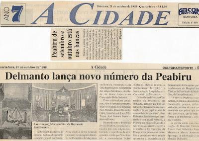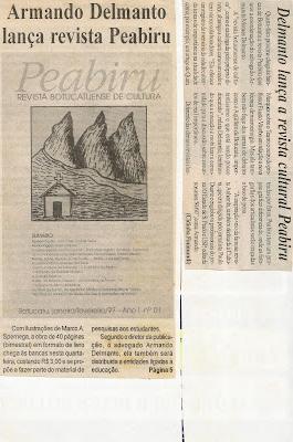 Amigo e confrade Armando, Manhã chuvosa, impediu-me de visitar a chácara. Fui remexer os meus guardados. Não é que, no correr das estantes, a “PEABIRU” chamou-me atenção. Nas mãos, o número 01 ano I de janeiro/fevereiro 1997. Além de você e eu, quem terá a coleção completa? Vinte anos decorridos de sua primeira edição. Como passa o tempo! Lá estavam Hernâni, Elda, Quim Marques, Fausto Viterbo, José Celso Vieira, Paulo Francis, Armando Delmanto, José Pedretti e eu. Nesse correr dos anos perdemos Elda, Hernâni, Marins... Coisas da vida, no dizer de Roberto Carlos: Muitos choques de opiniões! PEABIRU deixou saudades. Contribuiu para a preservação da cultura botucuda e a divulgação da Academia Botucatuense de Letras que vai completar 45 anos de fundação. Parabéns, amigo. Levanto a taça à sua iniciativa. Saudações, Olavo Pinheiro Godoy - Secretário da ABL - Academia Botucatuense de Letras.