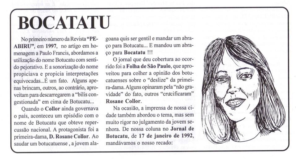 “Sem querer bancar o enxerido, acho que não se pode ser tão rigoroso com a primeira-dama porque errou o nome de Botucatu. Deu um viva a “Bocatatu”. Uma vergonha, disse um. Falta de consideração e de cultura, disse outro. Devia ir capinar em Canapi, disse, trocadilhesco, um terceiro. Só o bravo militante do PRN se mostrou compreensivo. E normal, muitos erram, disse ele. Nada como o bálsamo de um correligionário. Botucatu significa “bons ares”.
