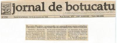 “Peabiru - Revista Botucatuense de Cultura”, sem fazer concessões popularescas. propõe-se a suprir um vazio no setor cultural da cidade e, vencidas as dificuldades naturais de sobrevivência como veículo de comunicação, certamente engrandecerá ainda mais nossa cidade nesse círculo restrito da cultura.