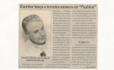 “O Dr. Armando Moraes Delmanto, prezado amigo e colega acadêmico, solicita-nos a colaboração no tocante ao nosso berço natal. Será uma prosa informal resultante da memória afetiva, mas sempre uma contribuição à pesquisa de Peabiru, revista característicamente voltada a sérios estudos dedicados às nossas origens..”