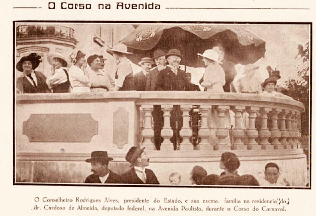 O Dr. Cardoso de Almeida teve vida intensa e destacada na Capital Paulista. Sua mansão construída na Avenida Paulista, esquina com a rua Hadock Lobo era ponto de encontro da sociedade paulistana. Exatamente na esquina foi construída uma varanda elevada para assistir aos eventos públicos na avenida, principalmente ao Carnaval. Local para se ver e ser visto. Como mostra a foto, durante um carnaval, com a presença do governador (presidente do estado) Rodrigues Alves e família, recepcionado por Dr. Cardoso de Almeida e família, além de inúmeros convidados.