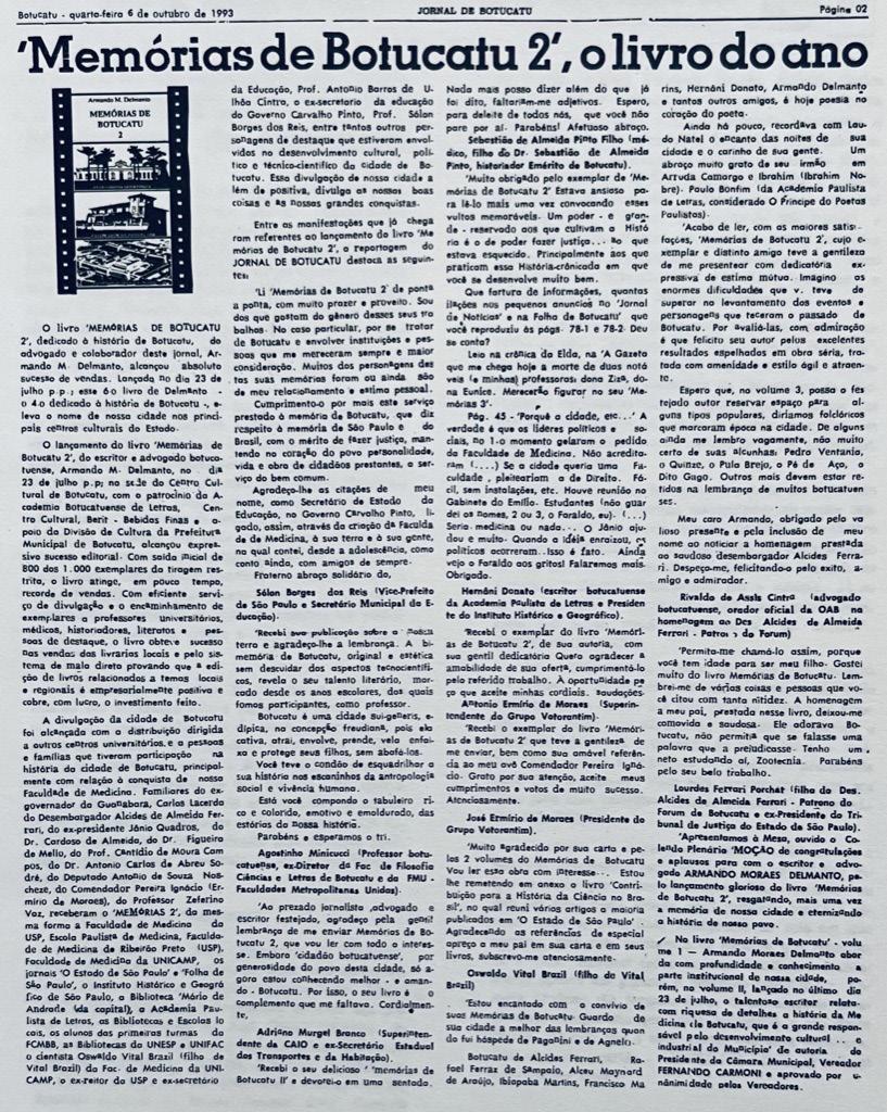 ARMANDO MORAES DELMANTO, com grande número de artigos publicados abordando os mais diversos assuntos, presta agora mais um inestimavel serviço à nossa cultura com a publicação do livro ‘MEMORIAS DE BOTUCATU II’ em que analisa sob interessantíssimos ângulos o desenvolvimento da medicina em nossa terra. Apoiando-se em numerosas fontes de pesquisa e depoimentos fornecidos pelas tradicionais famílias botucatuenses, põe em relevo os traços marcantes de personalidades de outrora, à qual nem mesmo o ferrete do tempo adverso conseguiu apagar da memória da cidade.